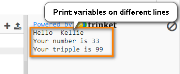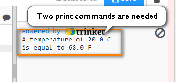 Your code from Activity 3.1 is a good starting point as this has a calculation in it. You only need two print commands instead of three