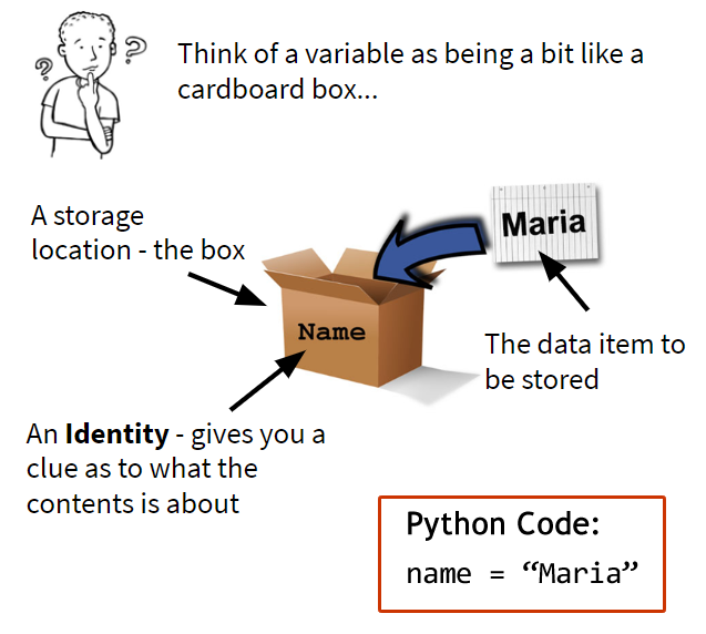In a computer program there is no actual cardboard box, but there is storage space set aside in the RAM. So data can be stored for later use by giving it a name to refer to it.